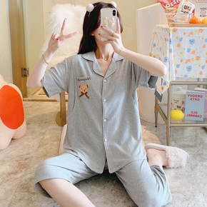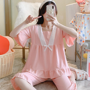 纯棉弹力坑条短袖七分裤月子服夏季薄款孕妇睡衣怀孕期...