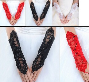 婚纱配饰手套 白色蕾丝蝴蝶结露指钉珠套指手套 无指...