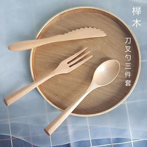 木质勺子叉子榉木三角手柄刀叉勺套装甜品勺叉菱形西餐...