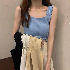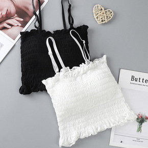 2022新款褶皱吊带背心木耳花边带胸垫可拆卸肩带打...