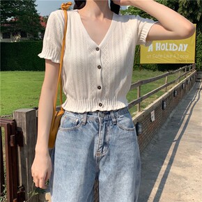 2022年新款白色针织短袖t恤设计感小众打底衫内搭...