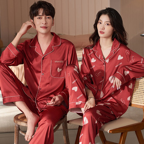 结婚情侣冰丝睡衣新婚丝绸套装春秋红色男本命年新娘仿...