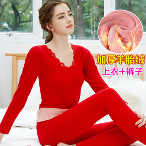 本命年大红色保暖内衣女士加绒加厚套装德绒无痕发热秋...