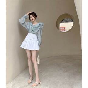超仙气质荷叶边长袖雪纺V领衬衫女+高腰百褶半身裙早...