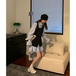 2021秋装新款韩版时尚收腰系扣马甲外套+纯色圆领...
