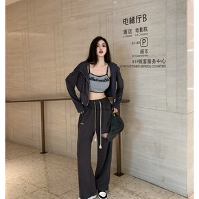 甜酷辣妹风长袖连帽短款卫衣外套+吊带上衣+破洞休闲...