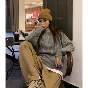 秋冬新款复古日系慵懒风麻花套头毛衣女宽松百搭设计感...