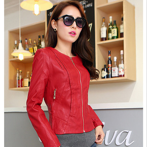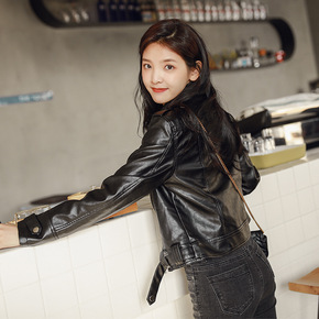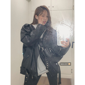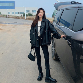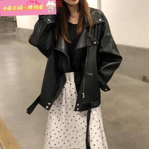 上衣夹克炸辣妹翻领女街外套pu宽松拉链显秋季皮衣机...