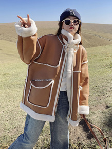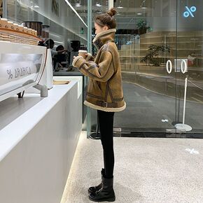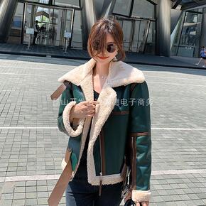 2022冬装新款绿色拼接大翻领机车服女加厚短款皮毛...