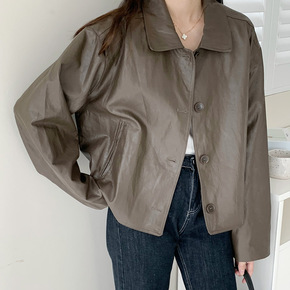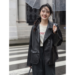 2021春秋季新款时尚立领皮衣女宽松短款黑色修身机...