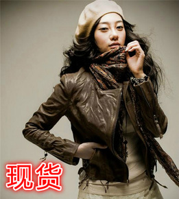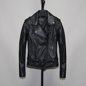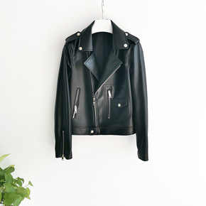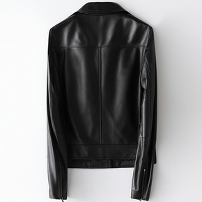 欧美机车夹克春秋黑色西装领绵羊皮短款皮衣小外套...