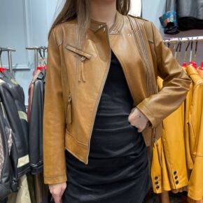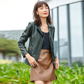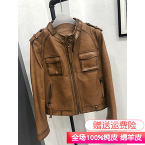 棕色2021年秋款真皮皮衣女短款修身小外套立领绵羊...