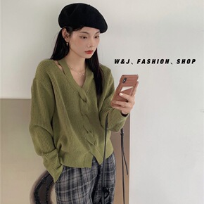 WJ韩版秋季新款V领复古淑女优雅休闲慵懒宽松百搭长...