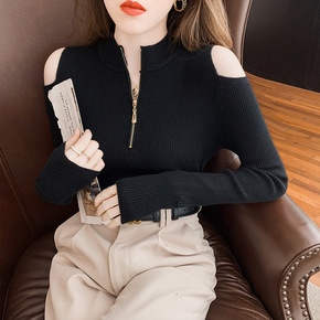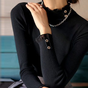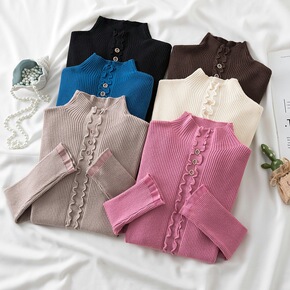 2021木耳边针织打底衫春秋冬季内搭女黑色百搭半高...