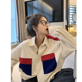 灯芯绒衬衫早春秋季女杏色拼接设计感小众气质复古长袖...