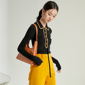 针织打底上衣2021初秋新款复古女装Polo领长袖...