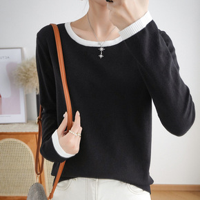 秋装新款撞色毛衣女圆领长袖打底衫女时尚宽松上衣内搭...