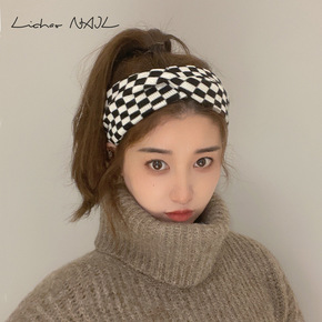 韩国时髦纯欲棋盘格发箍女复古弹力针织毛线头带运动外...