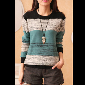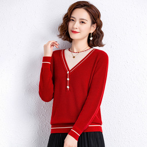 女 2019秋装新款V领拼色宽松针织衫宽松套头打底...