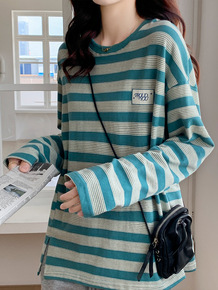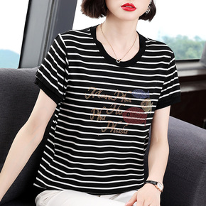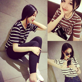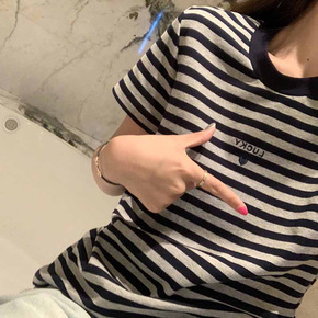 条纹短袖T恤女夏季韩版简约宽松显瘦打底衫休闲圆领上...