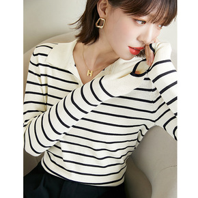 毛衣针织衫女装秋季小外套设计感POLO领条纹修身短...
