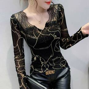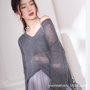 镂空透性感v领长袖套头宽松针织衫2021早秋马海毛...