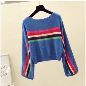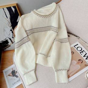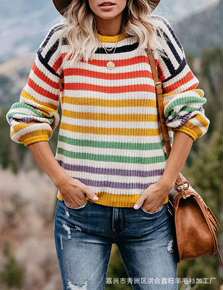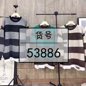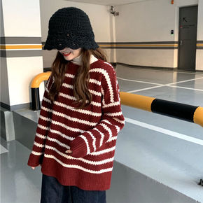 6000秋冬季新款韩版休闲圆领条纹撞色宽松慵懒针织...