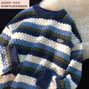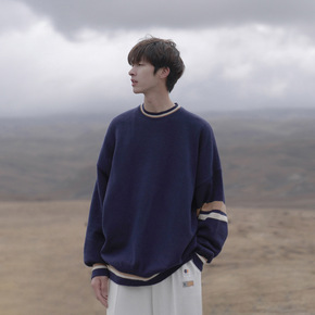 秋冬男士毛衣撞色条纹圆领宽松青春针织衫青少年打底上...