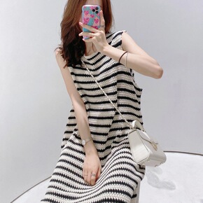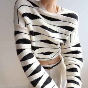 大码女装秋冬新款镂空流苏设计感小众黑白条纹针织衫女...