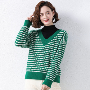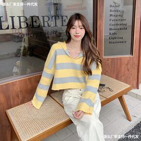 毛衣开衫女2021年秋冬新款洋气V领短款宽松条纹撞...