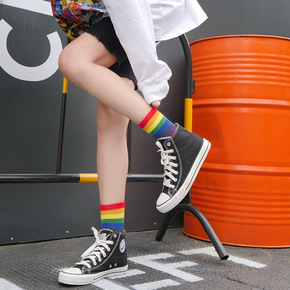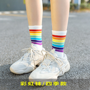 彩色彩虹袜子女中筒袜条纹日系长袜子潮流街头韩国糖果...