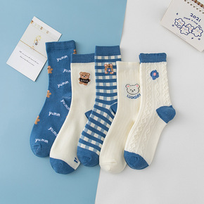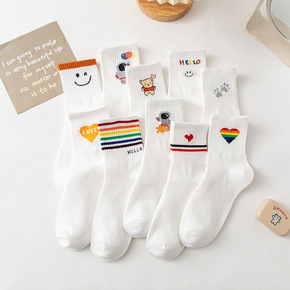 春秋新款白色卡通学生小熊彩虹字母爱心笑脸条纹女袜卡...