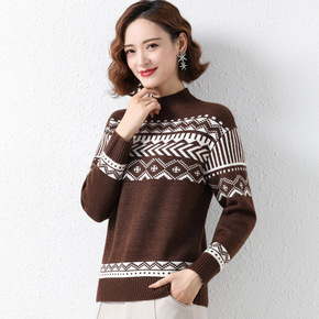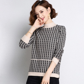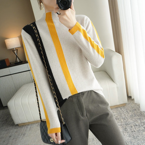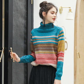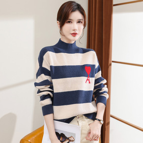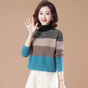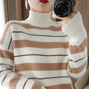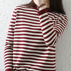 半高领羊毛衫2021秋冬新款女士套头条纹毛衣宽松内...