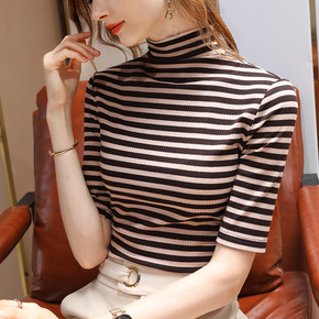 半高领打底衫女2021条纹时尚洋气网红百搭ins长...