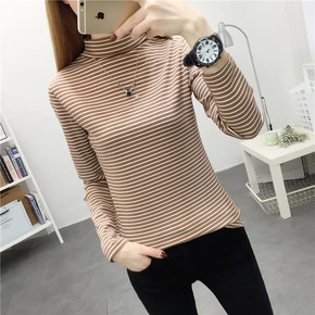 条纹打底衫女秋季2021年新款韩版百搭高领加绒上衣...