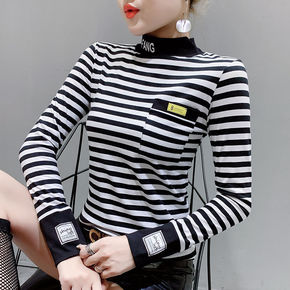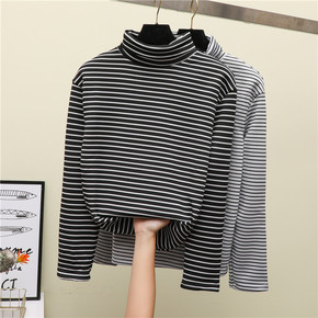 条纹半高领打底衫女白色春秋大码修身薄款内搭长袖T恤...