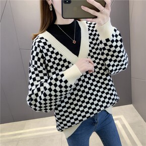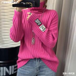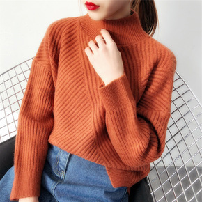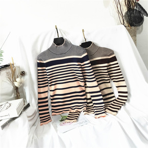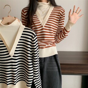 秋冬季半高领条纹长袖针织衫女士宽松显瘦外穿假两件打...