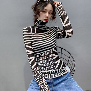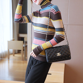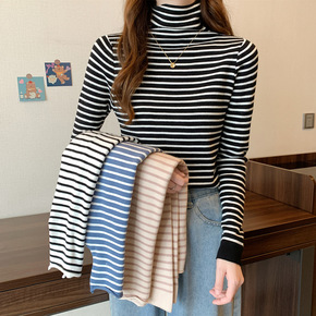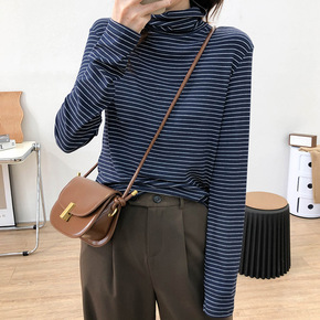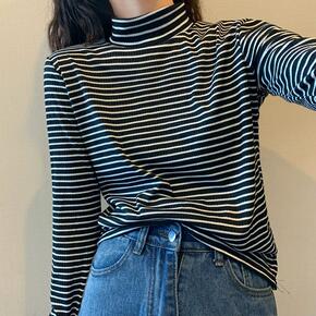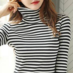 秋冬学生新款chic半高领条纹长袖t恤女针织打底衫...