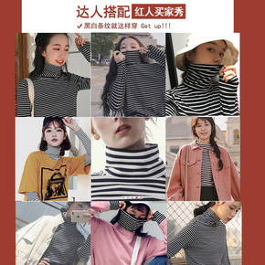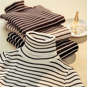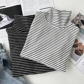 秋冬季新款百搭高领黑白条纹打底衫女内搭宽松堆堆领长...