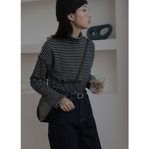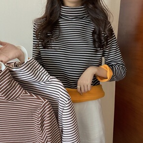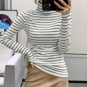 黑白条纹打底衫女春秋季半高领长袖t恤百搭炸街加绒堆...