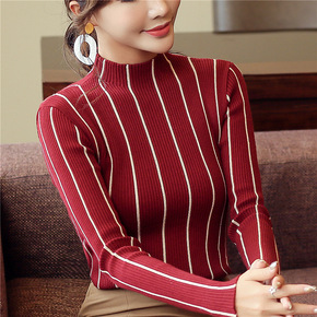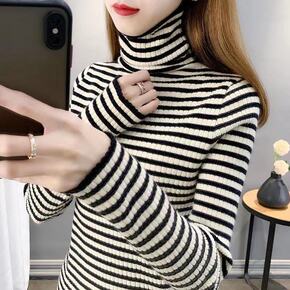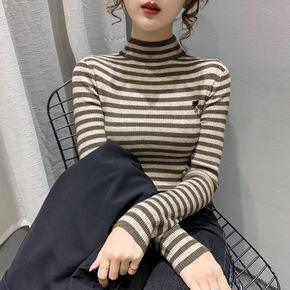 半高领打底衫条纹毛衣女套头2021秋冬新款修身针织...