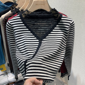 横行道半高领条纹修身长袖女t恤打底衫2022春秋新...
