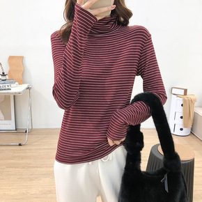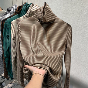 欧货条纹高领双面德绒打底衫女秋冬内搭堆堆领加绒加厚...