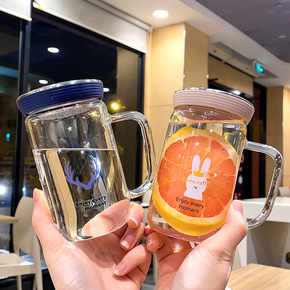 玻璃杯耐热防爆耐高温加厚有盖可爱便携带把手创意透明...