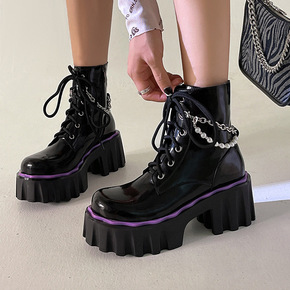 厚底松糕跟马丁靴2022秋季新款女靴串珠系带高跟鞋...