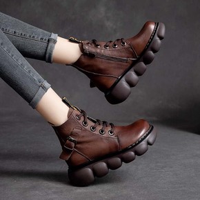 复古英伦风短靴女牛皮2021年秋款系带马丁靴女靴子...