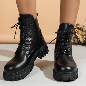 2021韩版朋克圆头厚底松糕短靴系带粗跟高跟马丁靴...