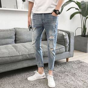 九分牛仔裤夏季薄款破洞男韩版潮流男士弹力小脚裤乞丐...