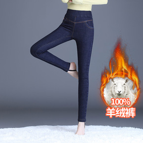 简约长款时尚羊绒牛仔小脚裤2021年冬款高腰松紧腰...