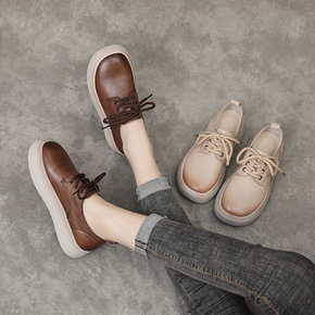 2022新款百搭韩版真皮女鞋圆头系带软底女式单鞋低...